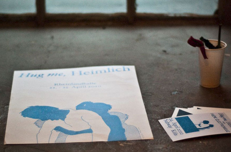 Nach der überraschenden Premiere im Vorjahr und dem Publikumsandrang bei der Langen Nacht der Museen ging das Festival für Nachwuchskunst vom 22. - 25. April 2010 in die dritte Runde und läutete somit offiziell den Kunstfrühling ein. Eigens dafür wurde eine neue Räumlichkeit erkundet: die Rheinlandhalle in Köln - Ehrenfeld. Als Off-Veranstaltung parallel zur Art Cologne präsentierte Hug me, Heimlich über vier volle Tage ein künstlerisch inspirierendes Programm, dessen heimliches Herzstück - die Gruppenausstellung - mit aufstrebender Kunst aufs Neue überraschte und dabei insgesamt 29 lokalen bzw. nationalen Künstler eine öffentliche Plattform eröffnet. Ein Schwerpunkt Medienkunst und eine dem Publikum zum ersten Mal präsentierte Mode- kollektion des Kölner Labels »Trinkhallen Schickeria« bereicherten ein einzigartige Selektion. Ein rauschendes Fest, zwei großartige Musikakts - The Lights From The Town (Köln) und Joy Wellboy (Brüssel), und viele kleine Überraschungen belebten die bedeutendste Kölner Kunstwoche Ende April.